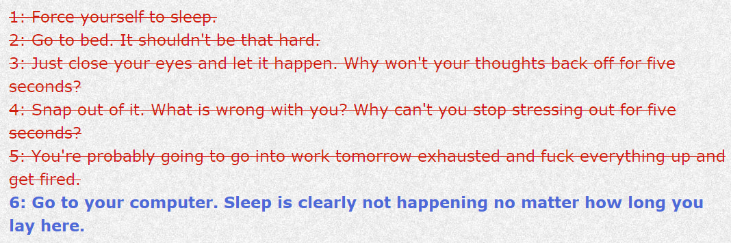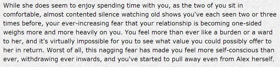 In an interview with Playboy, Quinn noted their interest in games that “aren’t there to make the player feel exceptional.” Depression Quest takes this intention much further than the player being just unexceptional, though; the player/protagonist is actively unable to perform what would be considered by many to be basic, day-to-day mundane tasks. The expected structure of interactive fiction is torn apart as positive choices are ripped from your hands before you can even consider their appeal: speaking to strangers at a party; making the choice to sleep when their body calls for it; talking to their partner about their emotions. It all seems doable, in a vacuum. But that’s depression. Actions that aren’t self-destructive become utterly herculean prospects, requiring internal strength you simply do not possess. There are no good options.