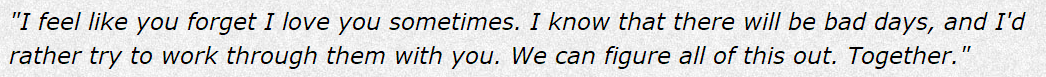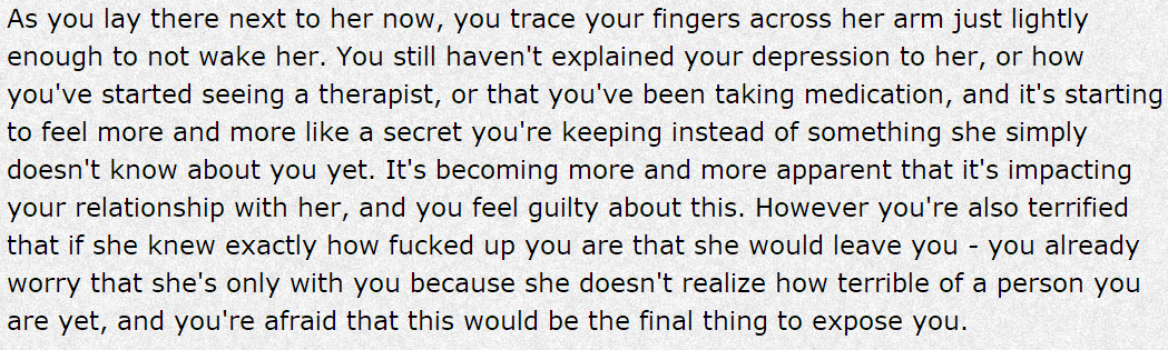 Depression Quest’s vision of being loved while sick is what we would all beg on our bruised knees for. Being loved even when neither you nor your lover know how to help. Even through the debilitating fear of loss upon this beautiful, perfect human being hearing your utter failure to exist as one — ‘There’s no way someone could deal with how you really are.’ It’s a familiar fear.