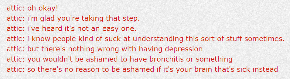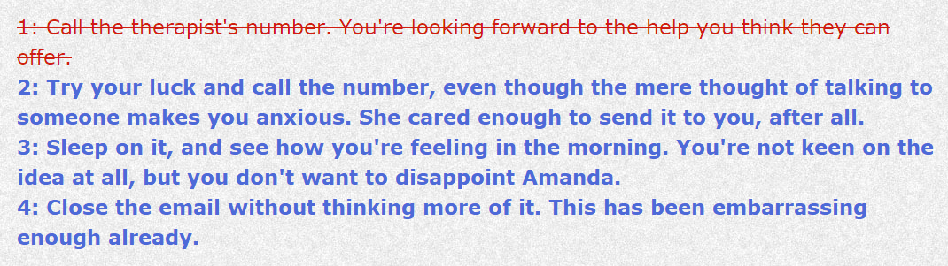 Depression Quest’s epilogue posits that ‘all we can really do with depression [is] just keep moving forward.’ I can’t disagree. In time, I have gotten better. Somewhat. I’ve wanted to, which has been quite a change in itself. I no longer see death as an option, let alone a good one. The economical option more frequently loses out in favour of no option at all. Text is limited to characters on a page, not blood on a blade. I have started spending my Saturday mornings with a therapist. I spill my guts, not my ichor. ‘This year, I’ve started wearing safety belts.’