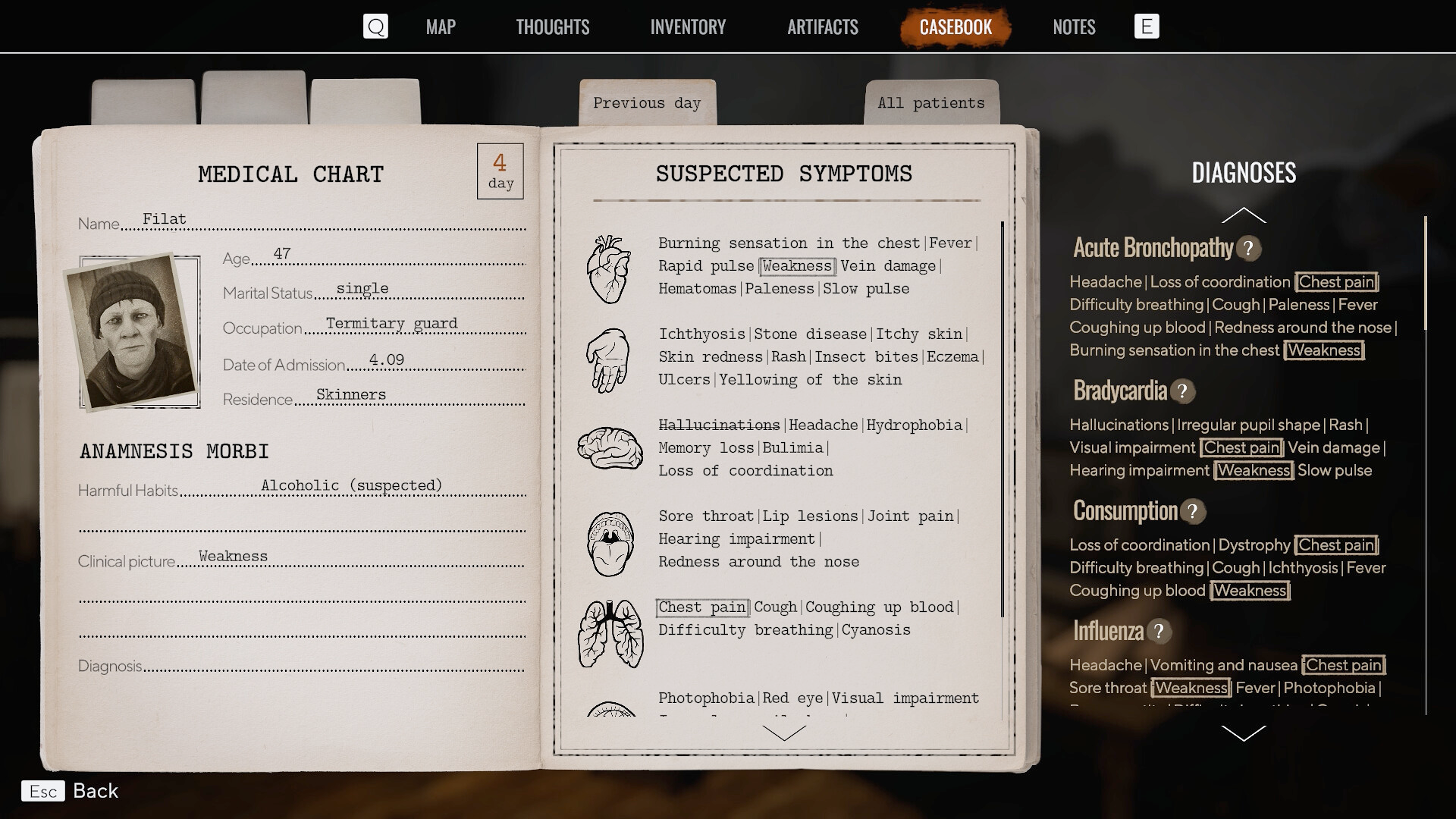 Once you open up a proper hospital in the Theater, diagnosing patients gets ever more difficult—many symptoms are red herrings to divert you from the real infirmity that resides within these frail bodies. Many questlines have to be completed for you to unlock useful decrees to sign in order to lower contagion enough to progress through the game. How many timeloops until you succeed? If your amalgam runs out, if you make enough bad decisions, there is still the threat of permadeath. Time is your second adversary, right behind the ever-present Plague.