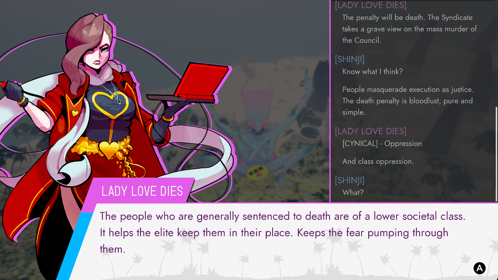 I felt similarly any time I talked to Henry Division, the only (living) citizen LD speaks with, who has an angry demon inside him. By all accounts, Henry Division should be dead for the crime of communicating with and summoning a demon 10 years before the game’s start, as well as for being the prime suspect behind the Council’s murder, given his unique situation. He doesn’t have much of an appetite for being alive, either. Conversations with him reveal that he’s screwed no matter how the investigation ends: not only are the Syndicate members itching to kill him, but being proven innocent still promises a shitty life. All he has to look forward to is more jail time with a demon or, if by some miracle someone took the time to free the demon from his body, more grueling work as a citizen. In his case, it doesn’t matter if justice is served or not. The future is just more punishment.