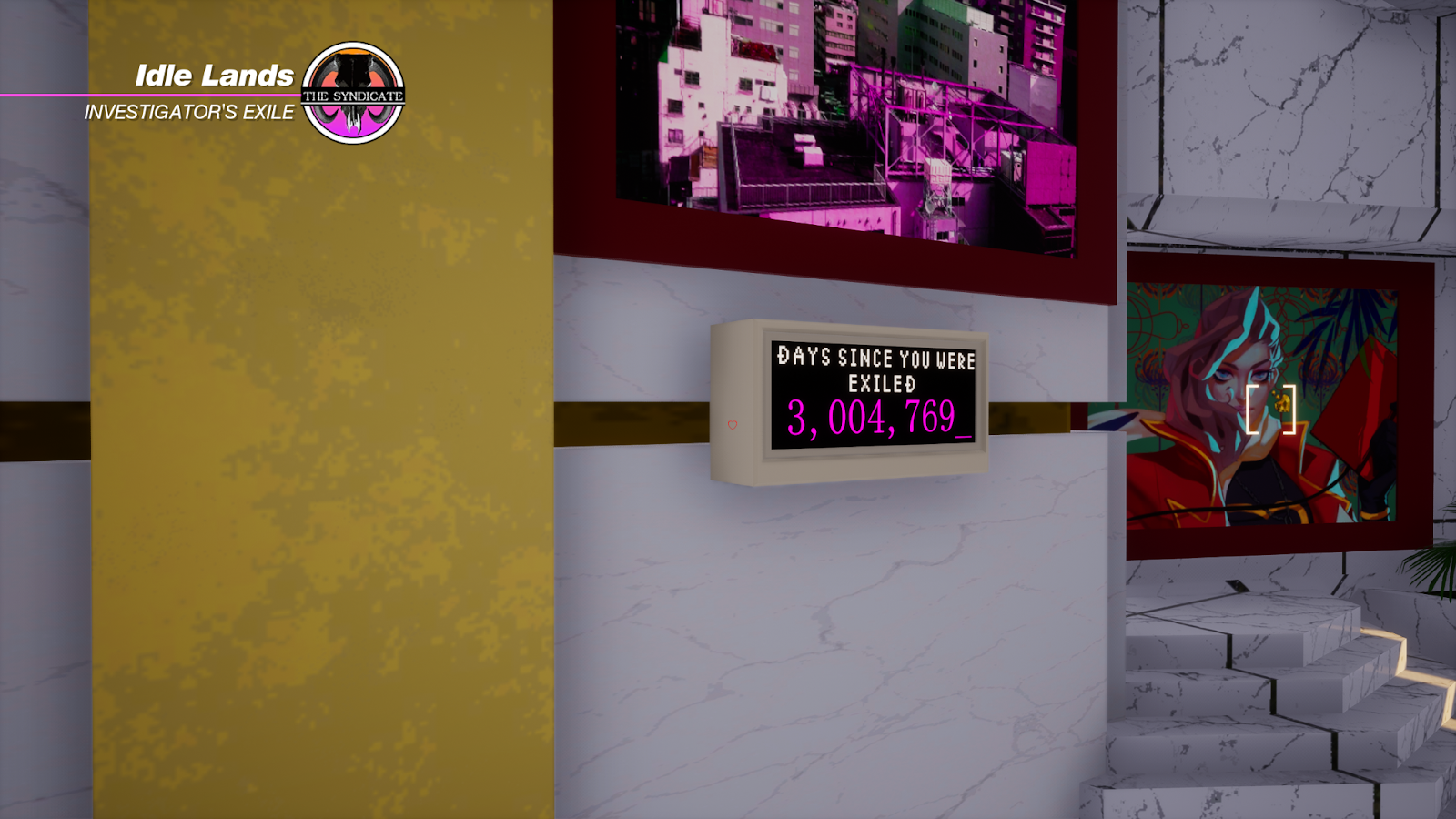 No one needs to ask these questions to know how fucked a place Paradise Killer’s world is. Everything I needed to know was told to me immediately by one number: 3,004,769. That’s what’s plastered on a timer that counts how many days the protagonist, Lady Love Dies (LD, as her friends call her), has been exiled to the Idle Lands. Following a guilty verdict laid out by the Syndicate, the genocidal god-worshipping and society-ruling organization that once considered LD a member, she was stripped of her status both as Investigator and Leader of the Paradise Psycho Unit before being cast into isolation. By the time Paradise Killer starts and Lady Love Dies has her role reinstated to solve the murder of the Syndicate’s top echelon, The Council, she has spent lifetimes without a soul to talk to for the crime of being seduced by the god Damned Harmony.
