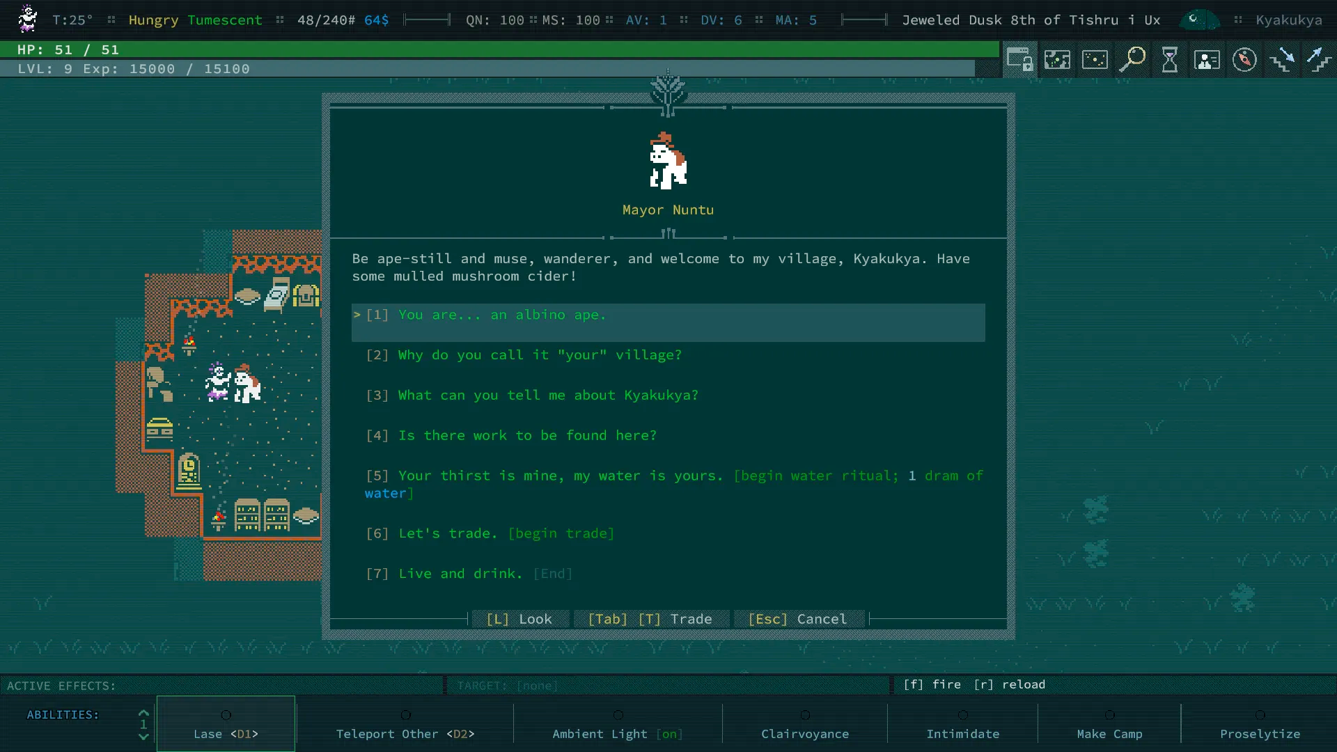 Caves of Qud's deep mechanical ingenuity is representative in moments like these. The game's tutorial teaches you the basics: how to move, how to fight, you must drink, you must eat, but otherwise leaves you to figure things out on your own. It wasn't just that I engaged in a simple process of mechanical gameplay: the love injector clearly described its effect in the inventory menu, but it was I who had to figure out that, if the ape refused the injection, I would have to equip it as a weapon and forcibly attack him. This then cascaded into a series of events: a new follower and a massacre.