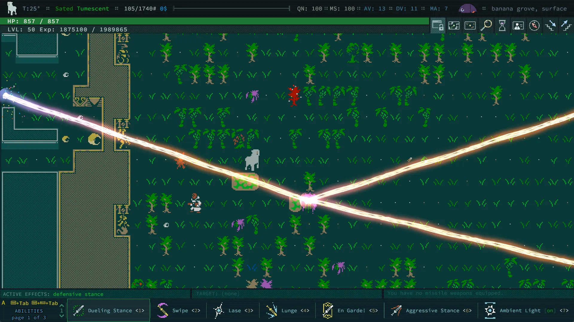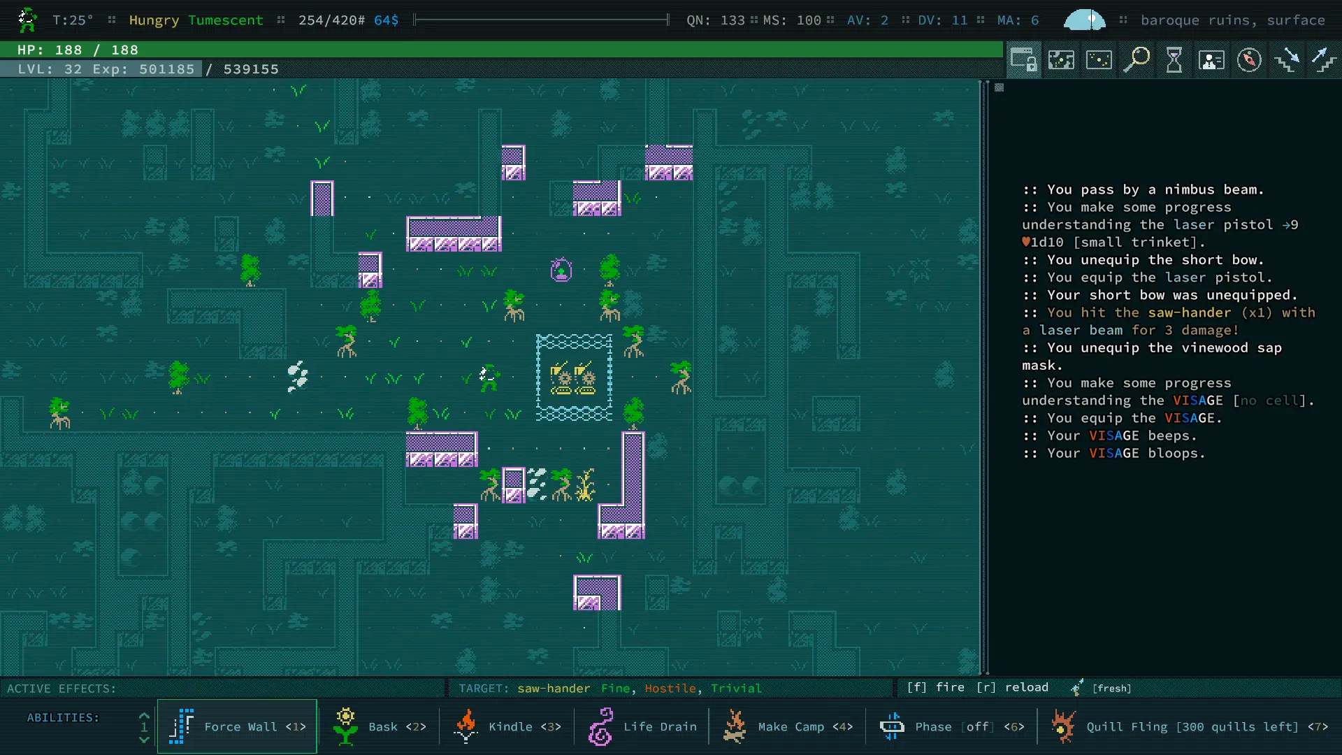 I annihilated any foe that came within axe-range in a tornado-flurry of bladed swipes. I felt unstoppable. Hubris is the biggest killer in the lands of Qud. Barely a few minutes after acquiring my destined mechanical arms, I was overwhelmed by a group of goatfolk in the jungle. I refused to run away, and died in reciprocated glory – with my guts being devoured by my worthy opponents.