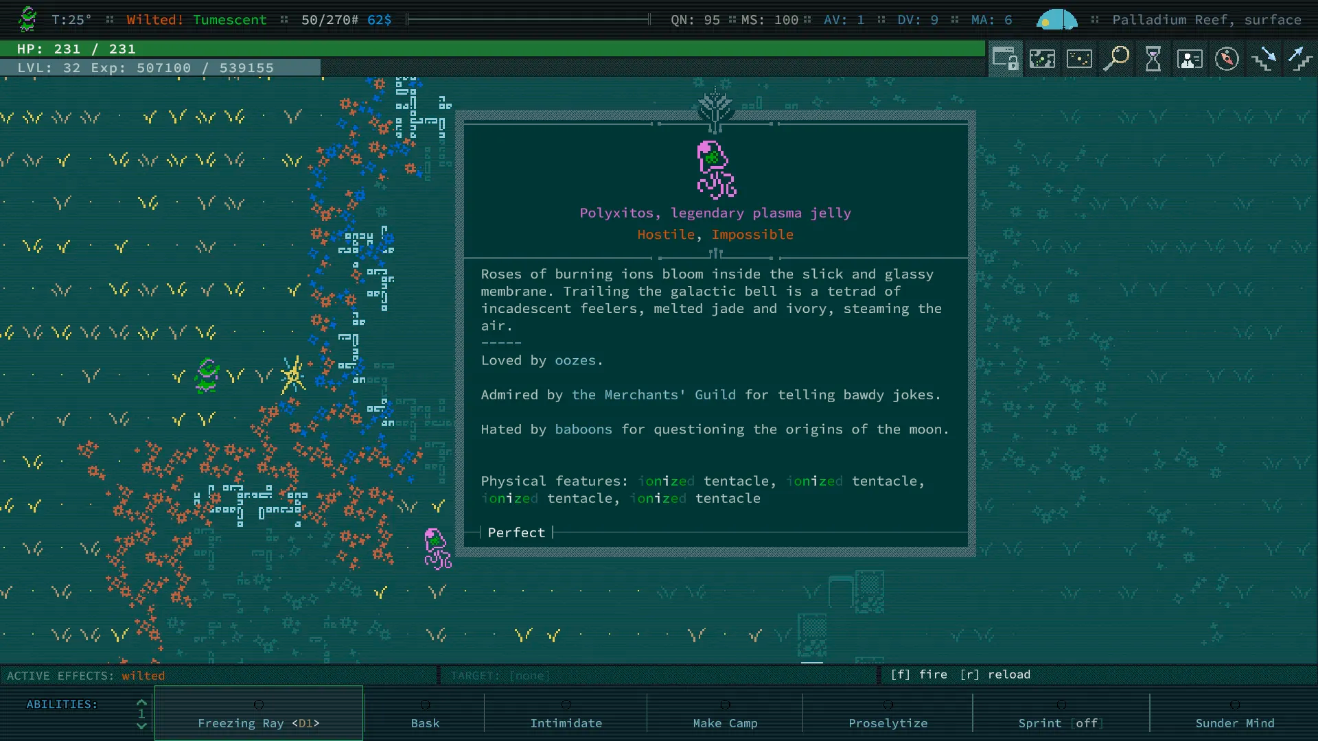 In a way, the most impressive aspect of Caves of Qud is its depth despite its lo-fi attitude. Indie games often contain the more unique and original game design philosophies at the cost of scope and graphical fidelity. CoQ teaches us we do not need to sacrifice immensity. We can represent it, mold it, play with it.