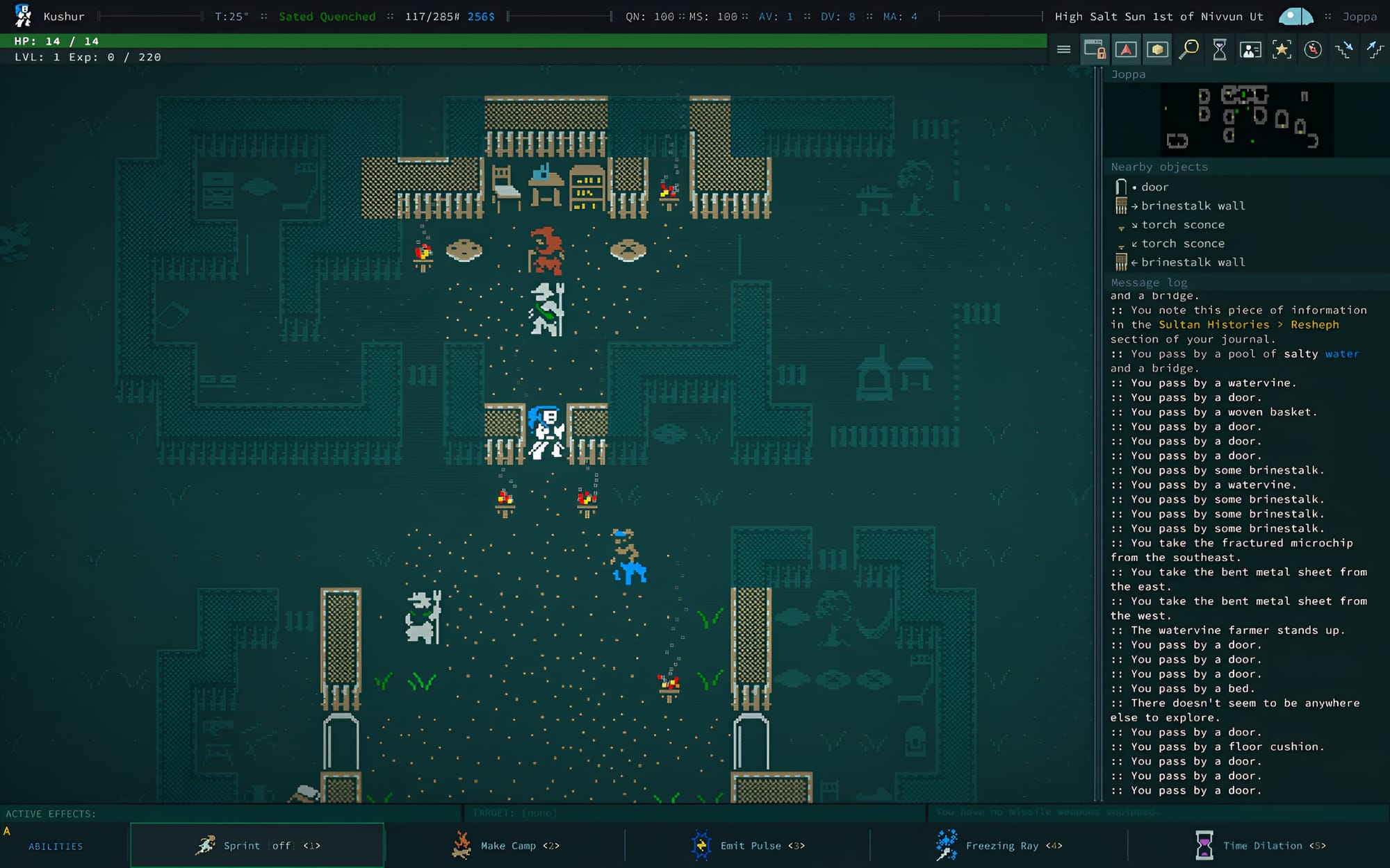 Identity is a core theme in Caves of Qud. Who you are matters, lore-wise and mechanically speaking. Be you mutated human or true kin, your starting character and village affect your interactions with the world at large. The character creator is complex – an overwhelming smorgasbord of customization that feeds into roleplaying possibilities. A four-legged greybeard is hated by the Templars of Putus, a Child of the Hearth can rebuke robots. Spawning in the salt dunes teaches your character the art of fasting, as food is rare and nothing grows in the saline soil, the desert canyons net you positive rep with the reptiles that call the arid landscape their home.